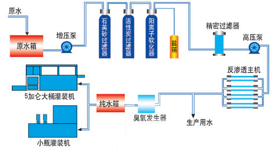 原水(自來水、地表水、地下水)經(jīng)過預(yù)處理系統(tǒng)(包括石英砂過濾器、活性炭過濾器、陽離子軟化器),精密過濾器,通過高壓泵將原水送至反滲透裝置直接產(chǎn)出產(chǎn)品水稱為單級反滲透。