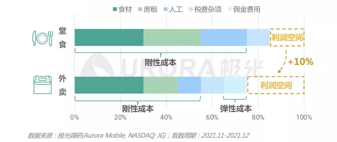 這也是國(guó)內(nèi)餐飲開(kāi)始重視對(duì)外賣業(yè)務(wù)投入的原因,相比較堂食的成本結(jié)構(gòu),外賣業(yè)務(wù)的成本更靈活一些。從報(bào)告的圖中可看,外賣的剛性成本如房租和人力支出等可得到壓縮,而多出的包裝材料、外賣傭金(技術(shù)服務(wù)費(fèi))這兩項(xiàng)彈性支出,都只有在發(fā)生交易時(shí)產(chǎn)生。因此,外賣整體的利潤(rùn)空間相較于堂食能夠獲得10%左右的提升。