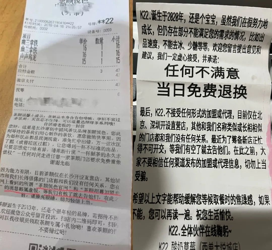 而新零售商業(yè)評(píng)論發(fā)現(xiàn),就在北京,一家名為K22的茶飲店,復(fù)制了這份小票營(yíng)銷(xiāo)法,包括那句“等我們有空了就去告他們”。只是這份拙劣的模仿,收效甚微。