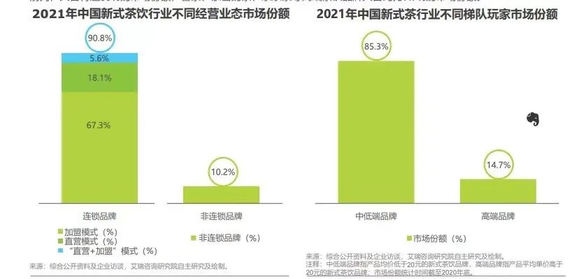 艾瑞咨詢發(fā)布的《中國(guó)新式茶飲行業(yè)研究報(bào)告》顯示,2021年,連鎖品牌占據(jù)整個(gè)市場(chǎng)份額的90.8%,以蜜雪冰城為代表的中低端連鎖品牌,有近50%的市場(chǎng)份額,此外,喜茶、奈雪的茶和樂(lè)樂(lè)茶等高端品牌,則有7.7%。