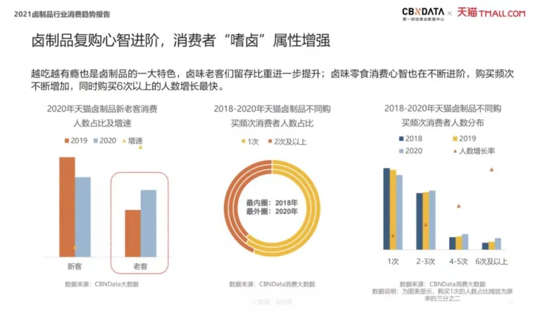 市場(chǎng)容量上看,鹵味同樣前景不俗。根據(jù)CBNData的報(bào)告,2020年鹵味市場(chǎng)(包含佐餐鹵制品、休閑鹵制品)規(guī)模已突破3000億元,年復(fù)合增長(zhǎng)率達(dá)20%。