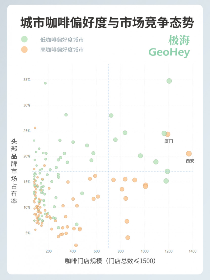 誰能更能夠滿足這一需求呢?主要是各大型咖啡連鎖品牌,他們無論是在便捷性、知名度還是成本價格上都對小眾咖啡店形成了碾壓性的優(yōu)勢,所以我們才會看到,在這些低偏好的城市,頭部品牌的市場占有率普遍高于平均,非常集中。