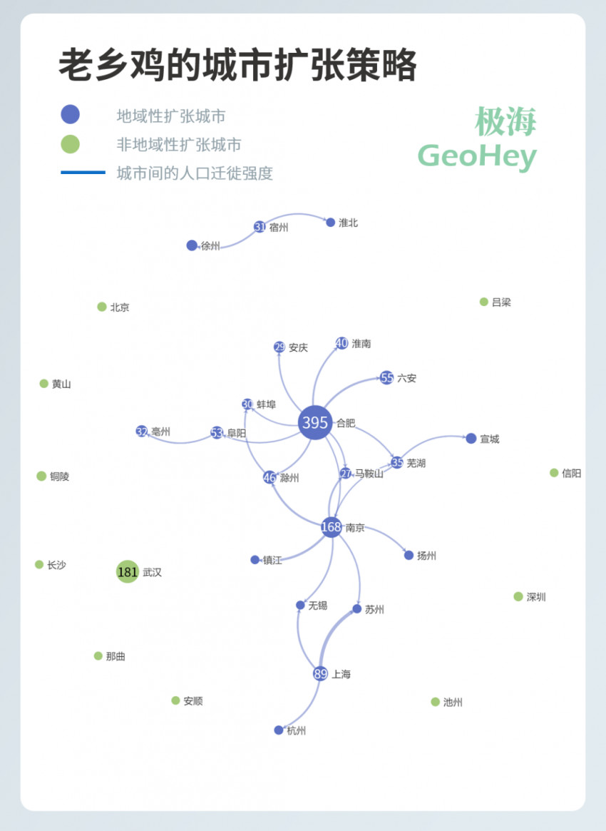 以老鄉(xiāng)雞為例,將城市之間的人口流動頻繁的城市鏈接起來,老鄉(xiāng)雞的城市分布就像是一張緊密相連的大網(wǎng)。