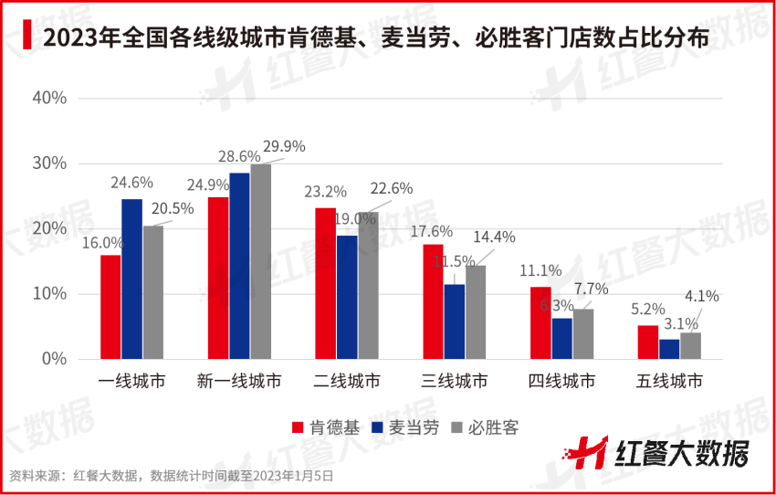 紅餐品牌研究院近期發(fā)布的《《中國(guó)西式快餐品類發(fā)展報(bào)告2023》顯示,截至2023年1月5日,肯德基、麥當(dāng)勞、必勝客分別約有33.9%、20.9%、26.2%的門店位于三線及以下城市,可見三者還在持續(xù)拉近與下沉市場(chǎng)消費(fèi)者之間的距離,持續(xù)推進(jìn)下沉策略。