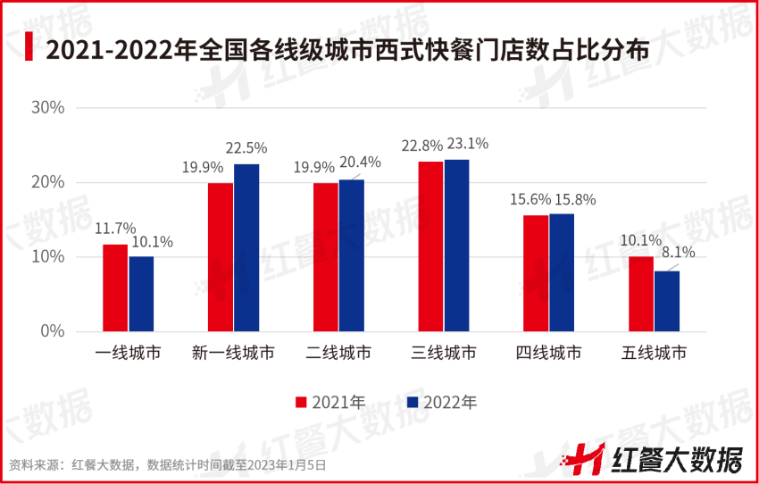但是下沉市場(chǎng)并非藍(lán)海市場(chǎng),競(jìng)爭(zhēng)也非常激烈。據(jù)紅餐大數(shù)據(jù),2022年全國(guó)約有67.4%的西式快餐門店分布于二線及以下城市,相比2021年,新一線、二線、三線、四線城市的門店數(shù)占比均有所提升。