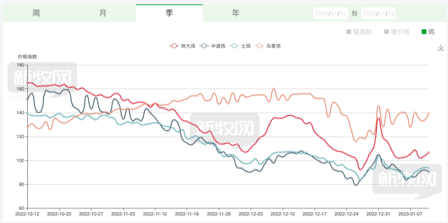 根據(jù)新牧網(wǎng)數(shù)據(jù),快大雞和中速雞在去年11月底跌破成本線,即使在今年1月后逐步回升,依然在成本線下徘徊。截至1月11日,快大雞全國均價5.49元/斤,中速雞5.62元/斤,土雞7.33元/斤,烏骨雞8.45元/斤。