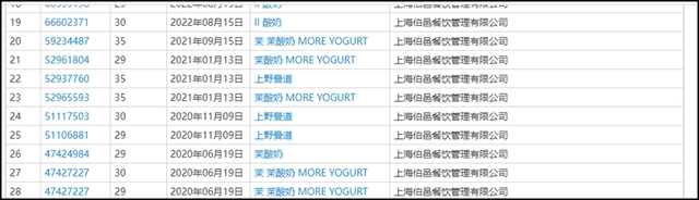 而據(jù)天眼查APP顯示,茉酸奶母公司上海伯邑餐飲管理有限公司于2023年7月4日申請了“上野曼道”商標(biāo),國際分類為29-食品。也就是說,茉酸奶使用的上野曼道原料為公司自有產(chǎn)品。