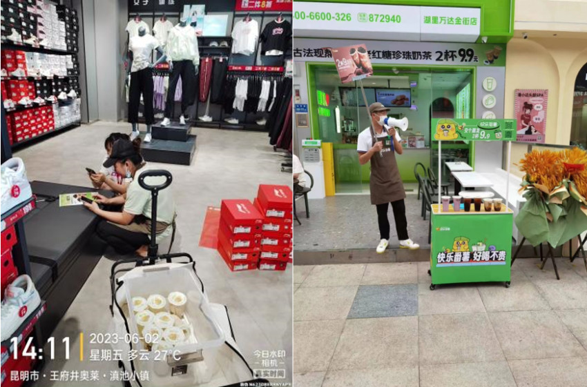 “擺攤”流行已久,在社交平臺上有著大量的關(guān)注和傳播。這是與消費者最直接的接觸方式。為了能夠讓門店進一步貼近消費者,為門店創(chuàng)造更多“隨手買”的機會??鞓贩泶罅块T店開始走上街頭,解鎖不同消費場景。為了支持門店,快樂番薯區(qū)域干部們紛紛下到門店,為門店吶喊助威。