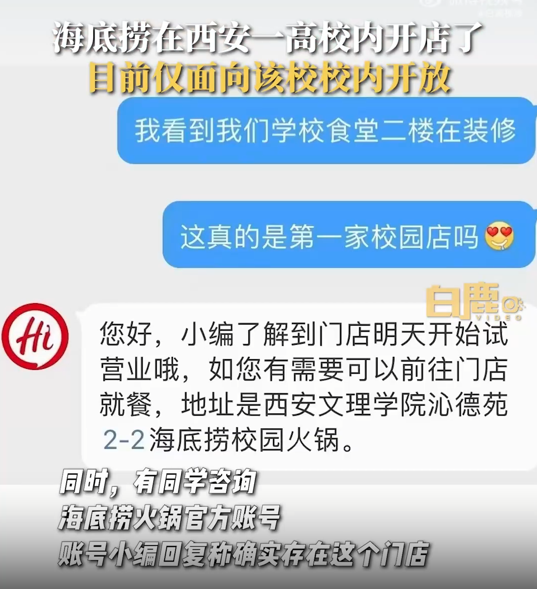 近日,陜西西安有網(wǎng)友發(fā)帖稱,海底撈火鍋在自己就讀的大學(xué)食堂二樓開(kāi)了門店,同時(shí),有同學(xué)咨詢海底撈火鍋官方賬號(hào),賬號(hào)小編回復(fù)稱確實(shí)存在這個(gè)門店。