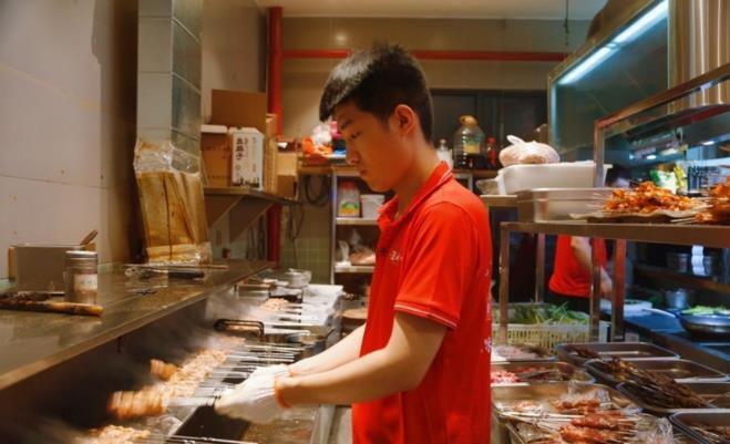 燒烤爐上擺滿肉串,服務(wù)員不停翻動(dòng)(央廣網(wǎng)記者 唐磊 攝)