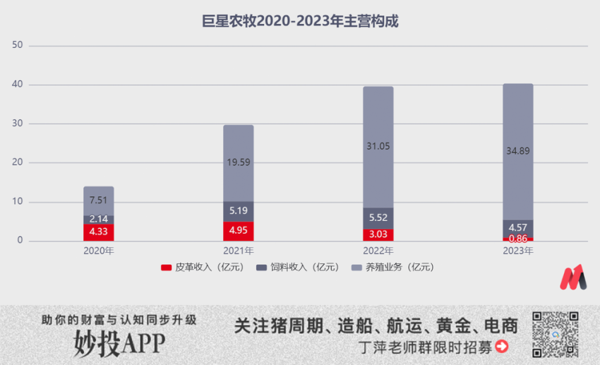 巨星農(nóng)牧始創(chuàng)于1993年,原主營業(yè)務為中高端皮革的制造和銷售,于2020年7月完成對巨星農(nóng)牧有限公司的重組后,增加了生豬養(yǎng)殖業(yè)務。此后,生豬養(yǎng)殖業(yè)務逐漸成為其收入主力,到了2023年,該業(yè)務占營收比重高達86%。