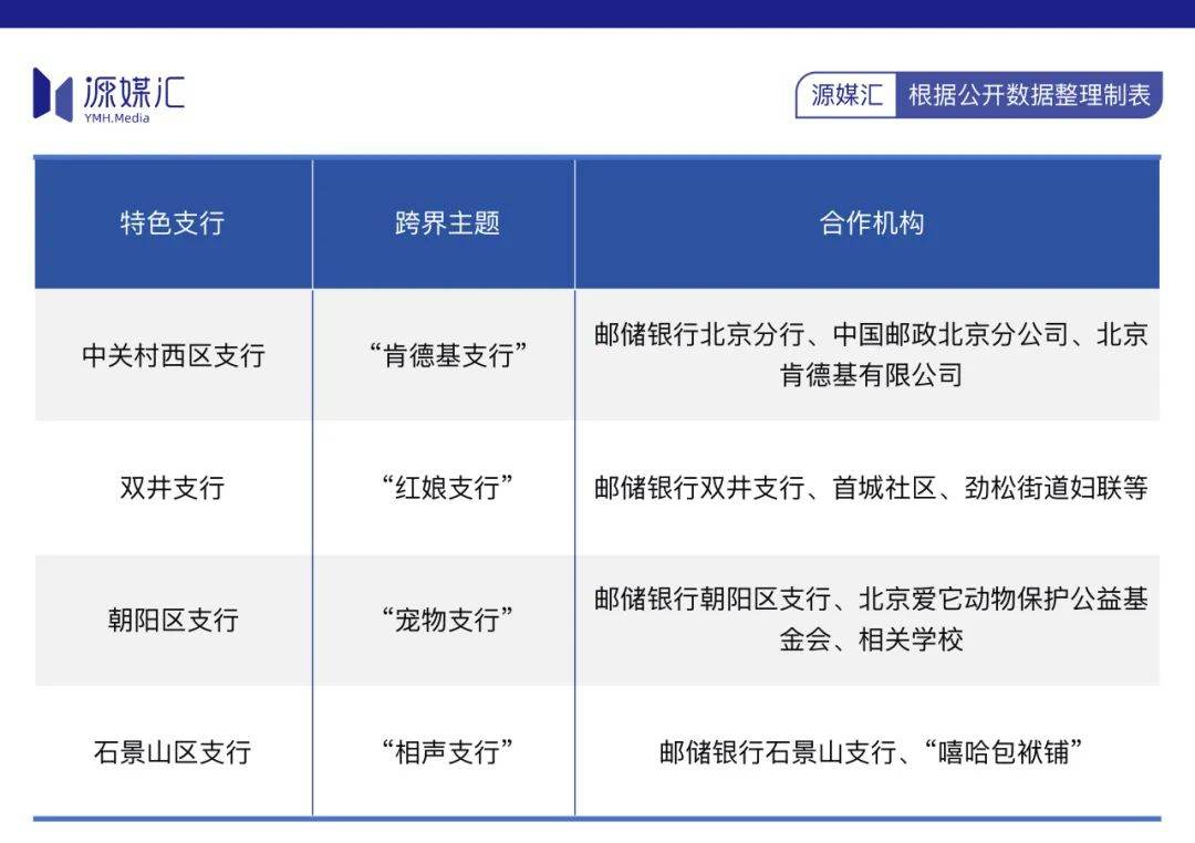 除了“肯德基支行”,郵儲銀行北京分行還在北京地區(qū)打造了形式多樣的特色主題支行,包括“紅娘支行”、“寵物支行”、“相聲支行”等,極具創(chuàng)新特色。這批特色支行都是郵儲銀行在2024年創(chuàng)辦的。