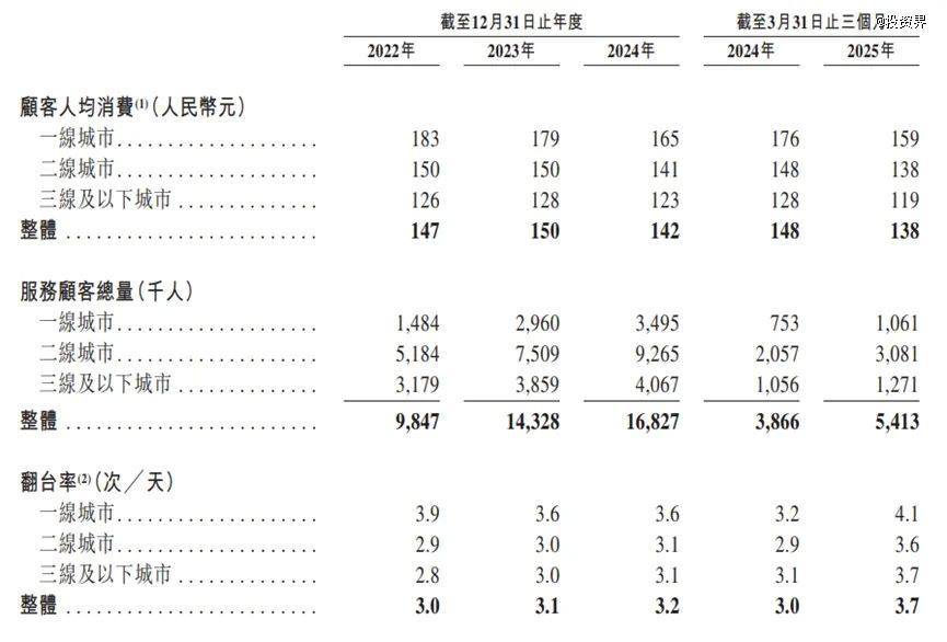 從價(jià)格來看,巴奴毛肚火鍋的整體消費(fèi)約在人均138-150元左右,在一眾火鍋品牌中價(jià)格偏高,而翻臺率由2022年的3.0增長至2025年第一季度的3.7。