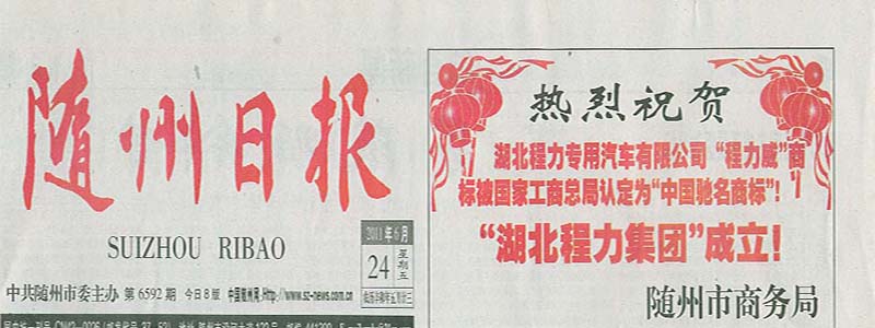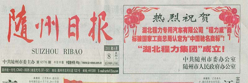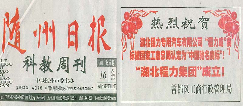 2005年建廠的湖北程力5年跨越發(fā)展,今年捷報(bào)頻傳:3月,獲國家工信部批準(zhǔn)的整車制造資質(zhì),成為隨州第5家獲此資質(zhì)的企業(yè);5月29日,“程力威”商標(biāo)被國家工商總局認(rèn)定為“中國馳名商標(biāo)”,成為隨州第3件;6月1日,被省工商局批準(zhǔn)為企業(yè)集團(tuán),是隨州第4家集團(tuán)公司。