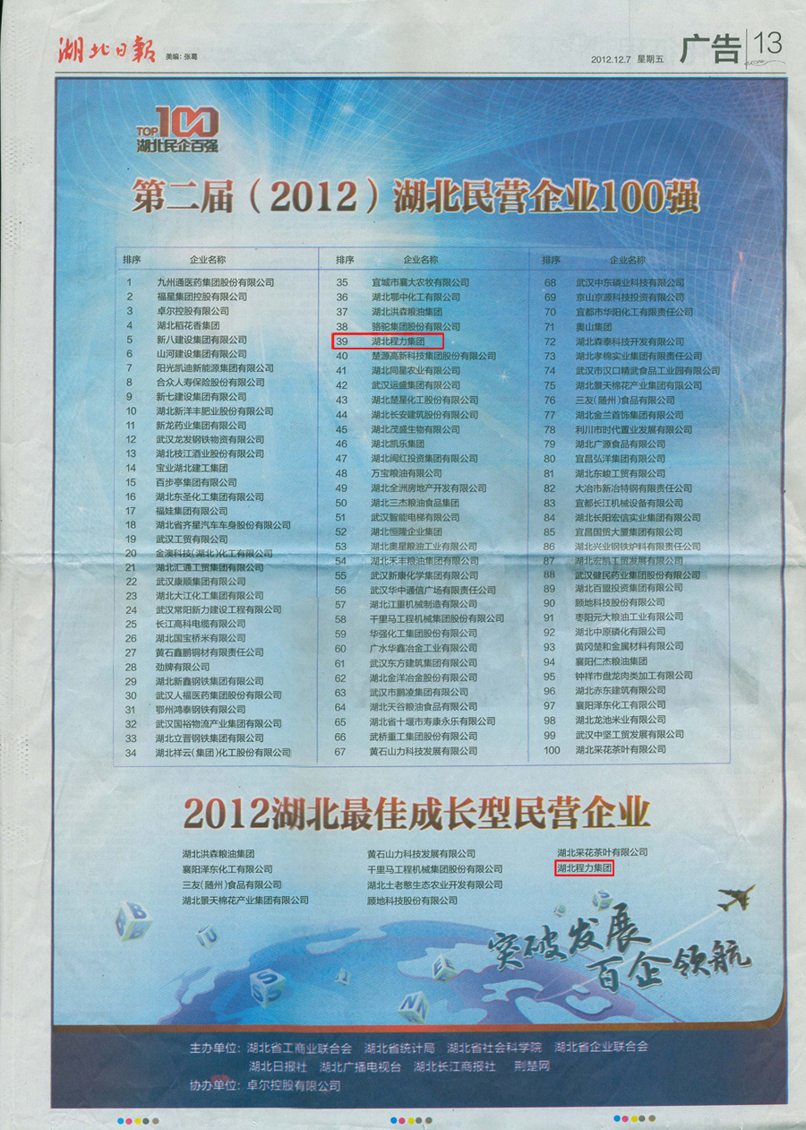 由湖北省工商業(yè)聯(lián)合會、湖北省統(tǒng)計局、湖北省社會科學院等單位舉辦的第二屆(2012)湖北民 營企業(yè)100強,昨天在湖北省民營企業(yè)100強出爐,湖北程力集團榜上有名。